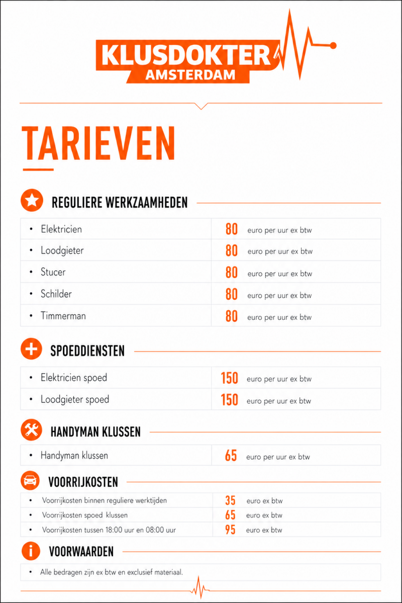 Klusdokter Amsterdam staat voor exclusief vakmanschap en absolute betrouwbaarheid. Wij hanteren transparante en zorgvuldig opgebouwde tarieven, zodat u altijd volledige duidelijkheid heeft vooraf. Geen concessies, geen verrassingen — alleen hoogwaardige service en perfect uitgevoerde werkzaamheden. Onze vakmensen combineren expertise met precisie en leveren werk af op het hoogste niveau, tot in elk detail.